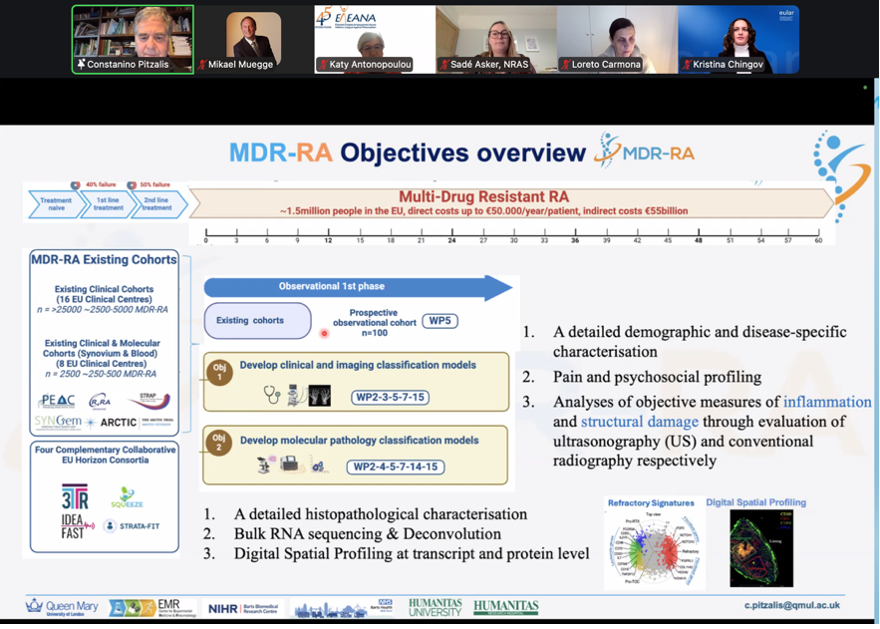 The webinar opened with an overview of the MDR-RA project by Professor Costantino Pitzalis (Humanitas University, Milan & Queen Mary University of London), the project’s Principal Investigator. He outlined the urgent challenge MDR-RA seeks to address: multidrug-resistant or difficult-to-treat rheumatoid arthritis (RA), a condition affecting a substantial proportion of people living with RA and associated with high disease burden, reduced quality of life, and significant societal and healthcare costs.